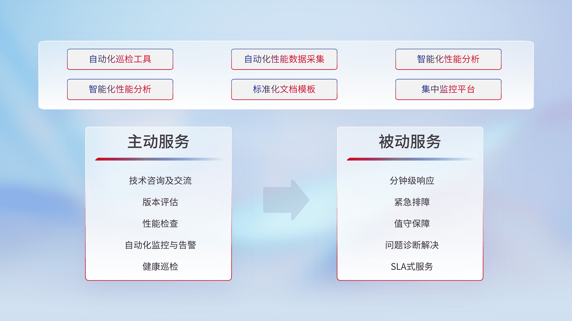 智能化工具和标准化文档,,,,保障服务质量,,提供主动服务(包含技术咨询、、、版本评估、、性能检查、、、、自动化监控与告警、、、健康巡检)和被动服务包含(分钟级响应、、、、紧急排障、、、值守保障、、问题诊断解决、、、SLA服务)。。。。